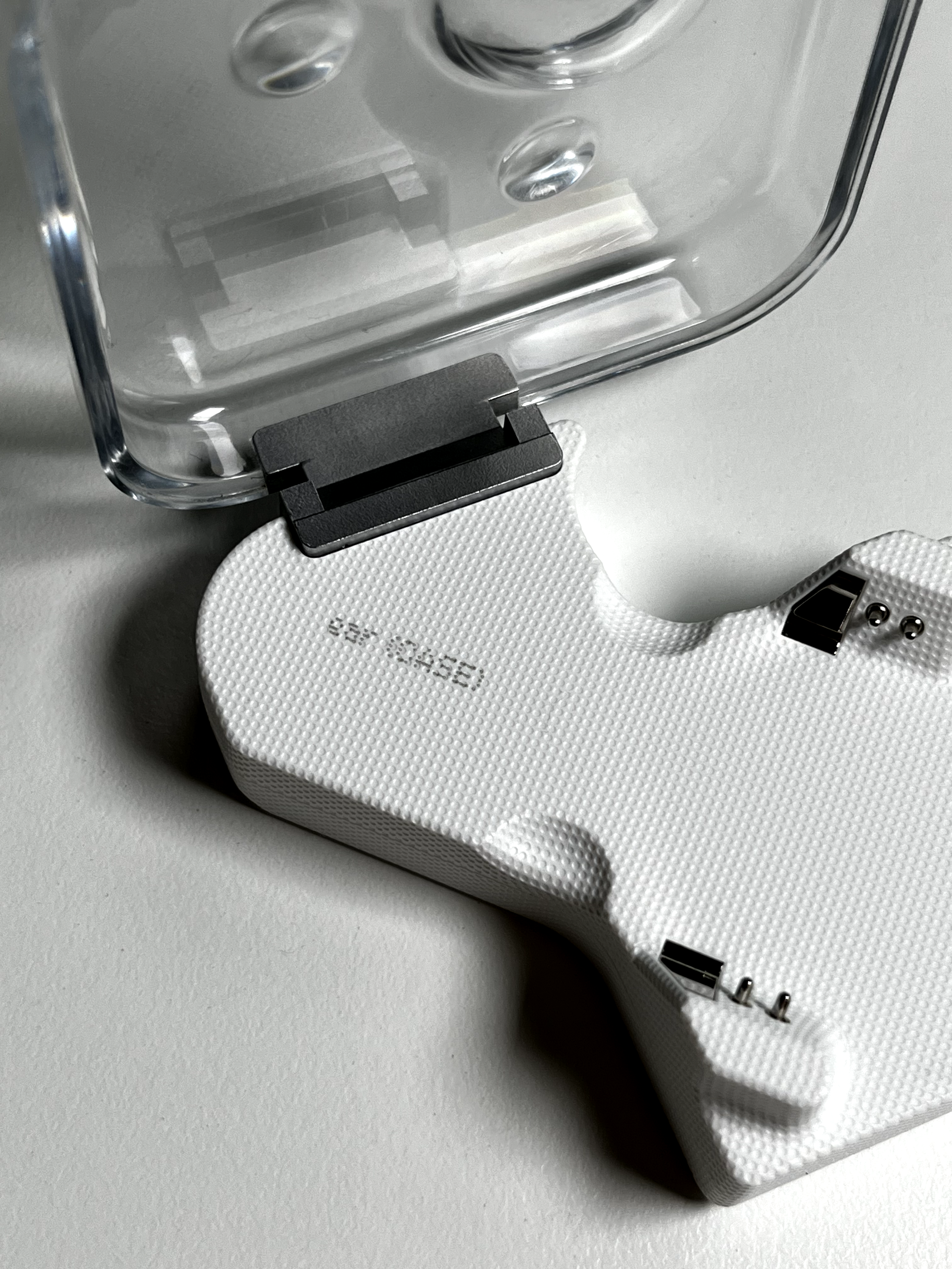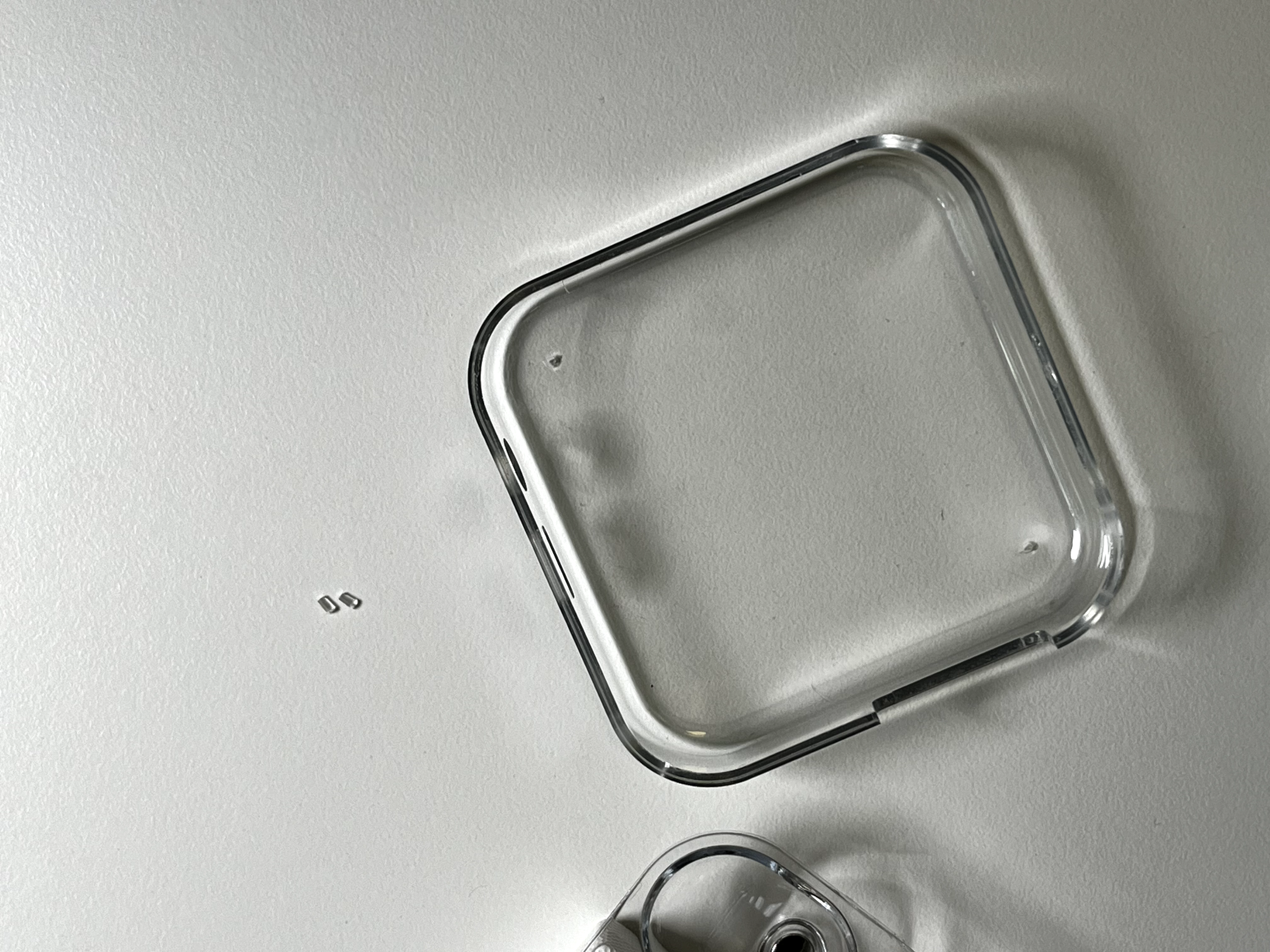 이제 남은 상단 플라스틱을 분리해 줍니다. 충전 핀이 플라스틱을 고정하고 있기 때문에, 유심 핀과 같은 물건을 사용해서 충전 핀을 안쪽으로 밀고 위로 살살 당겨주면 깔끔하게 분리됩니다. 분리하고 나면 본체의 투명한 파츠는 전부 없어지게 됩니다.