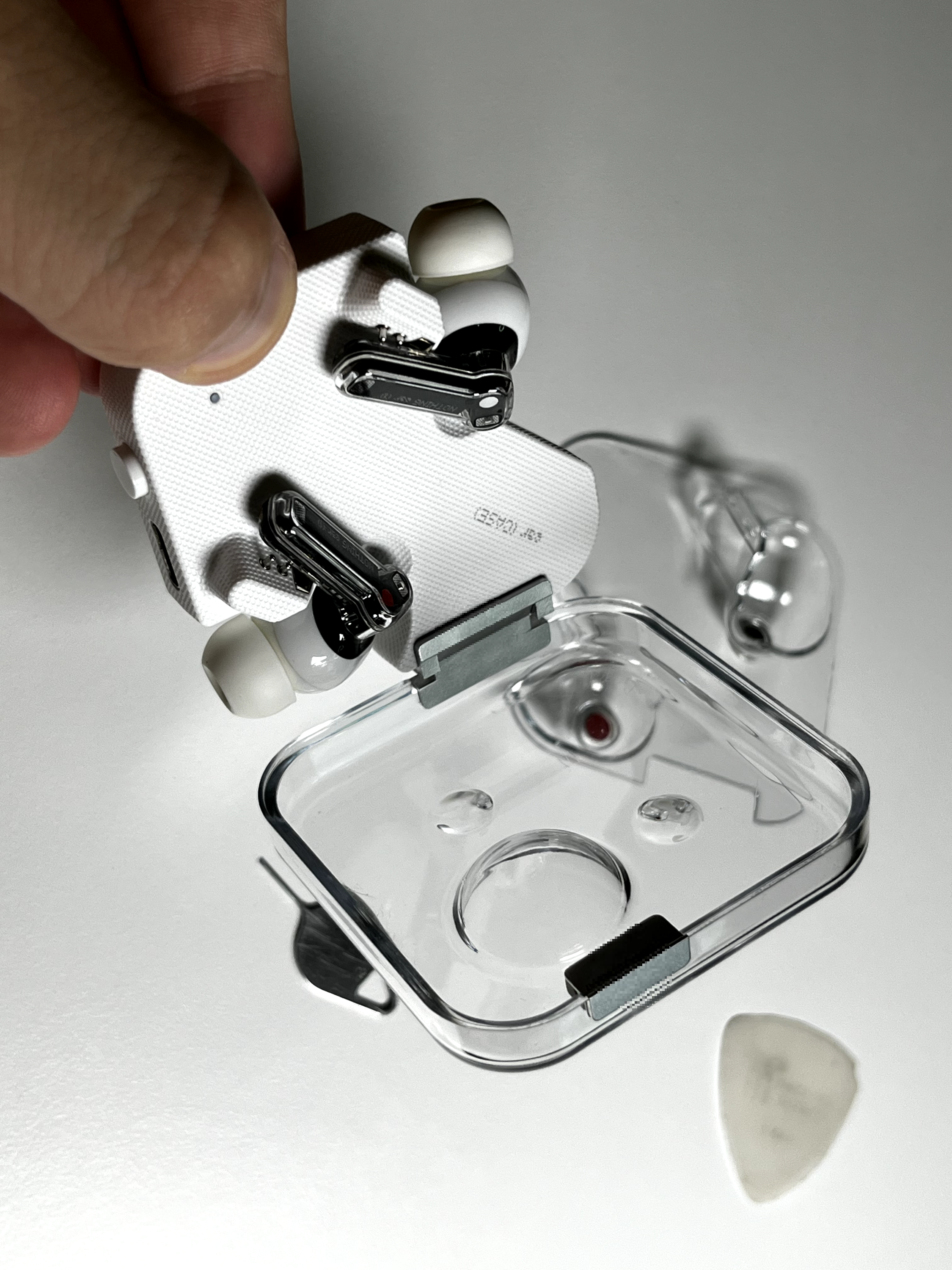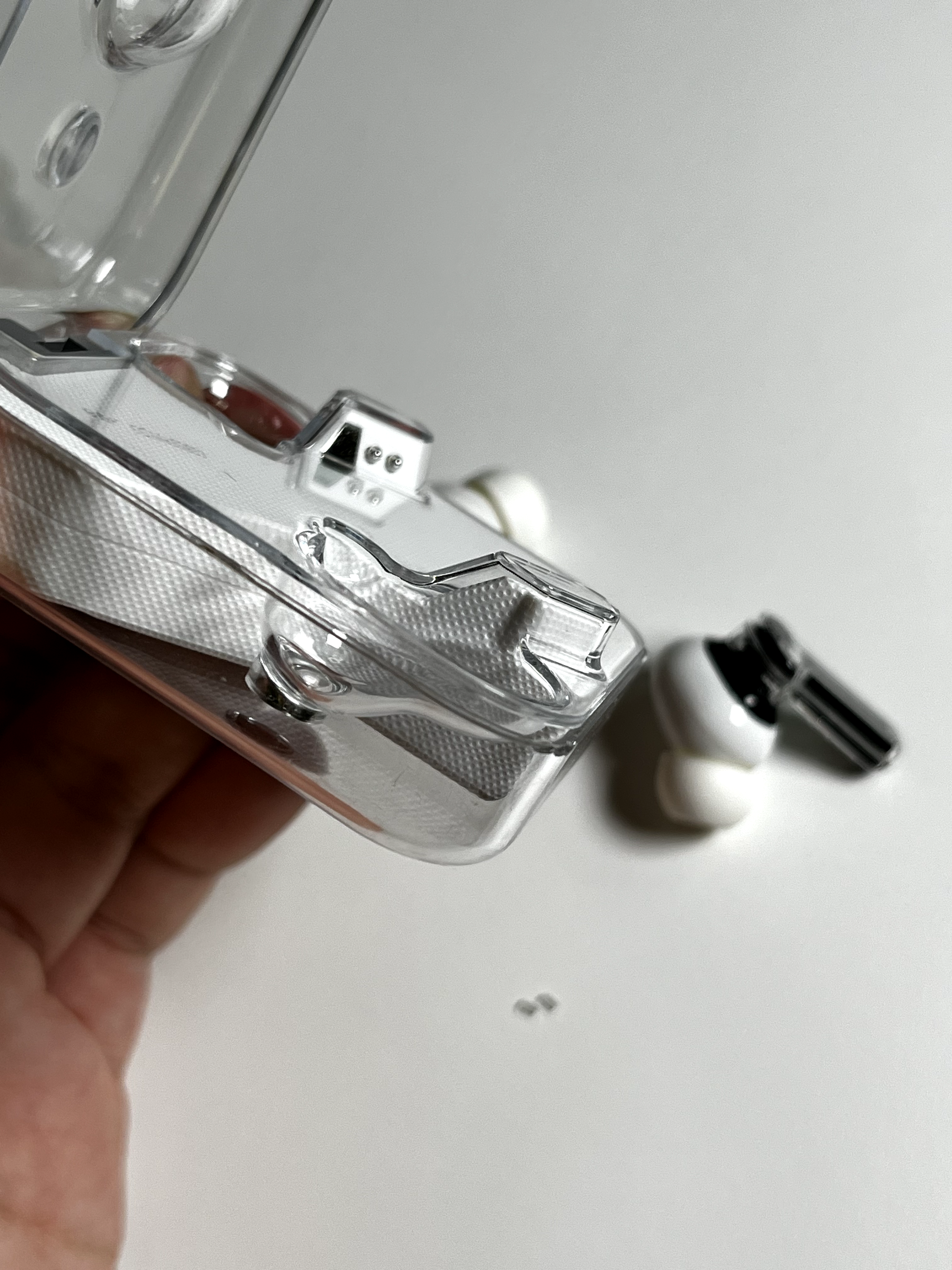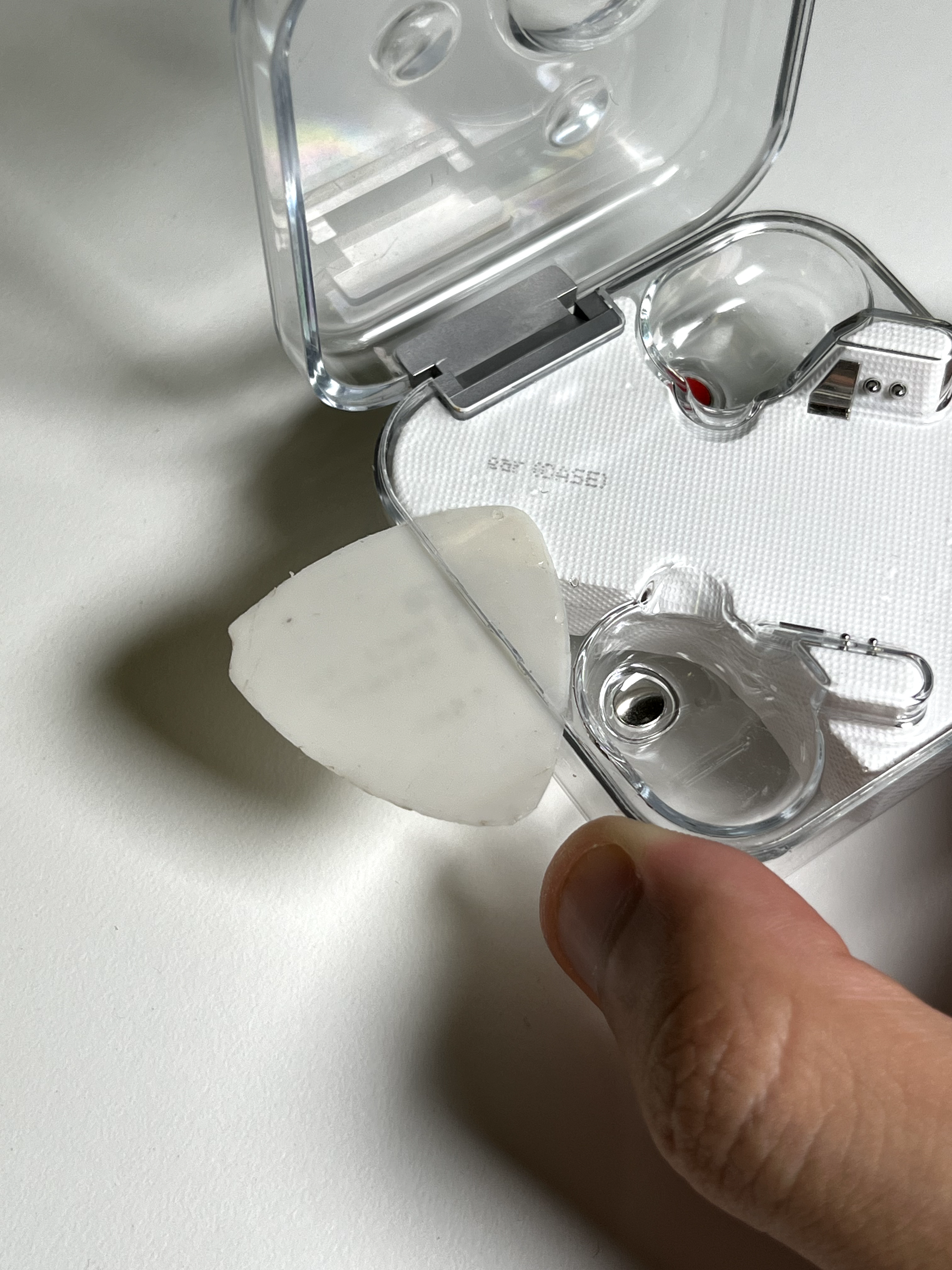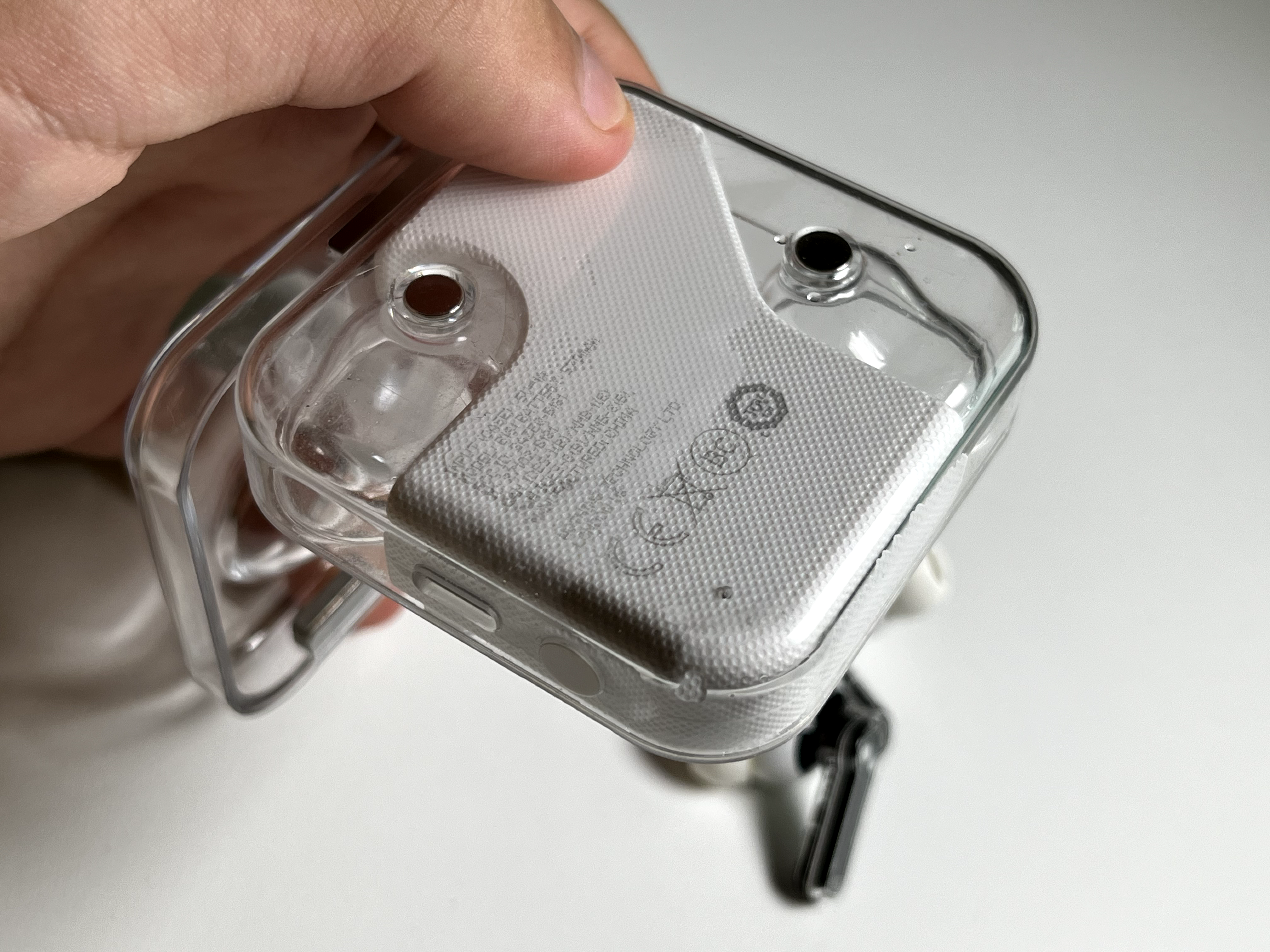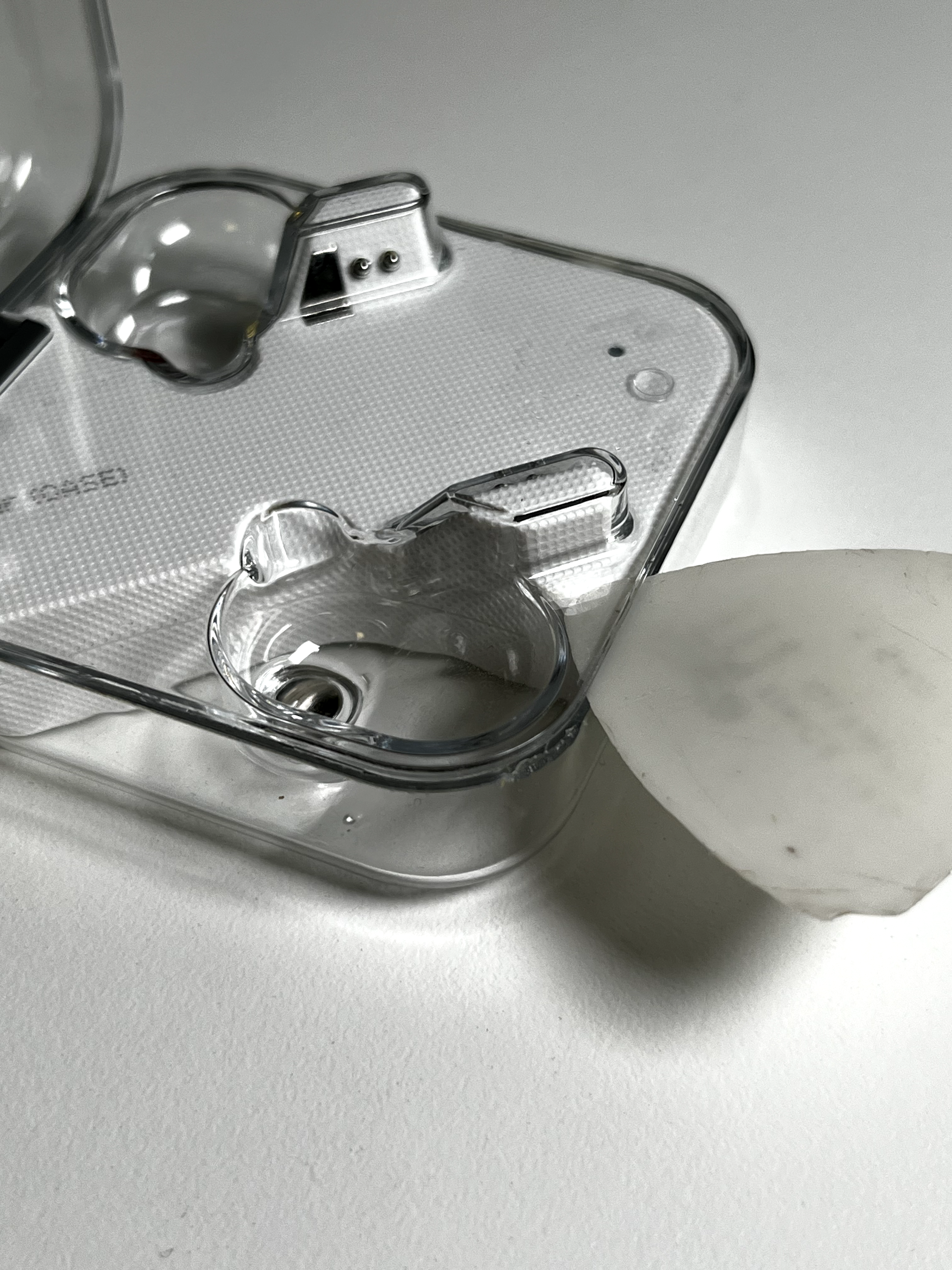 그리고 그대로 제 ear(1) 케이스 내부에 물과 습기가 유입되어버리고 말았습니다. 오래 사용하다 보니 생긴 깨짐이나 틈이 있었기 때문에 그 사이로 비가 새서 들어간 듯했는데, 알아서 빠지거나 증발하더라도 얼룩이 보기 좋지 않게 생길 듯했고, 이전에도 내부에 이물질이 자주 들어가서 이 참에 그냥 케이스를 분해하기로 했습니다.