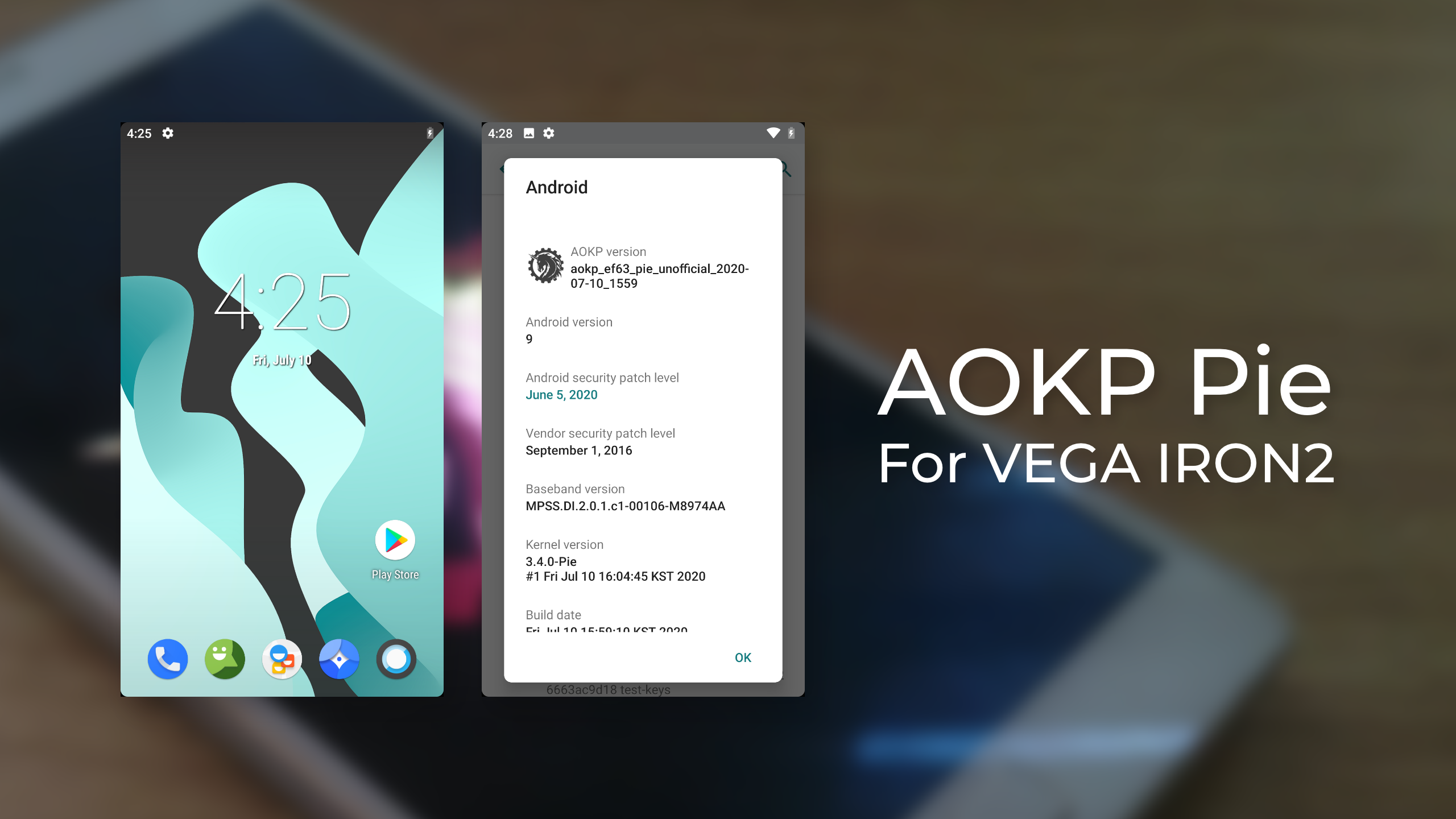 베가 아이언2용 AOKP Pie입니다. 디바이스 소스만 약간 수정한 뒤 빌드했으며, 2020년 6월 5일 자 보안 패치가 적용되어 있습니다.